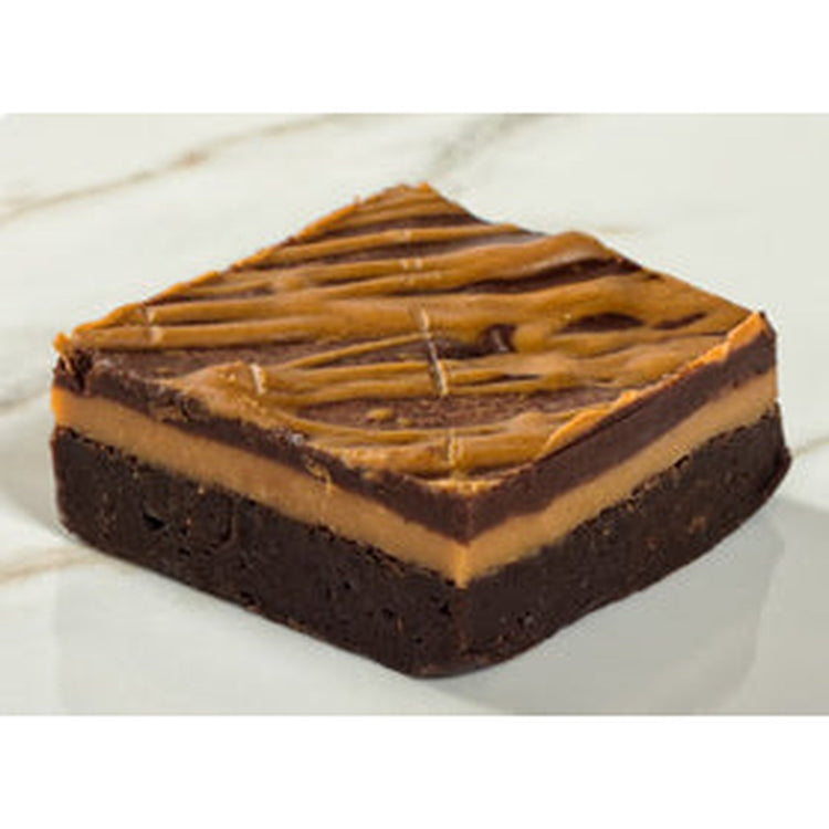 A delicious fudge brownie topped with a layer of salted caramel, then a layer of semi-sweet chocolate with a yummy chocolate drizzle topping.